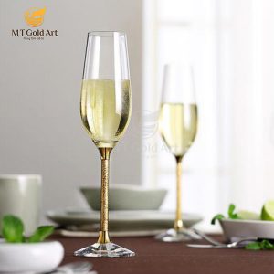 Bộ ly champagne cũng được chế tác từ pha lê cao cấp và phần thân ly có chứa những lá vàng 24k. Ly thiết kế miệng ly nhỏ gọn, thanh mảnh ly thích hợp uống rượu vang trắng. Vì rượu vang trắng nhanh bay hơi nên dùng ly có thể tích nhỏ để không bị mất đi hương vị. Người uống có thể hưởng trọn vẹn được hương vị của rượu vang trắng.
