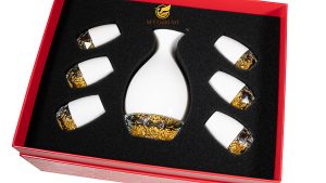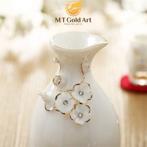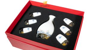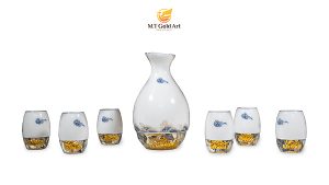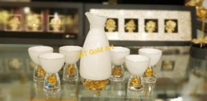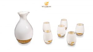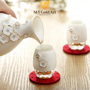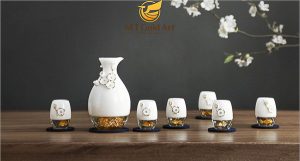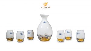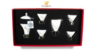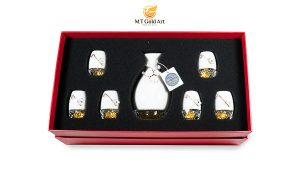 Thêm một sản phẩm nữa khiến những chém rượu thêm nồng đượm quyến rũ là bộ bình ly uống rượu pha lê sứ đúc vàng. Chúng ta đã quá quen thuộc với những bình ly rượu được làm hoàn toàn bằng sứ. Nhưng với sự kết hợp giữa pha lê không chì – sứ – vàng lá 24K thì đó thực sự là một điều khác biệt. Sản phẩm có thiết kế độc đáo vừa mang nét cổ điển vừa hiện đại. Điểm nhấn nằm trong hoa văn trang trí trên thân bình và thân ly hình mây và sóng. Không cần cầu kì tráng lệ, món quà này đủ để làm hài lòng cả những người khó tính nhất.