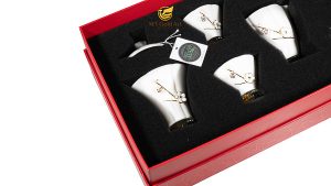 Bộ trà cao cấp pha lê Swarovski – sứ đúc vàng (khum) có thiết kế gần tương tự như “người anh em” phía trên. Vẫn là những đóa hoa mai nở rộ trên thân bình và ly. Vẫn là sự tổng hòa nhuần nhuyễn của pha lê, sứ và vàng lá. Điểm khác biệt duy nhất nằm ở kiểu dáng khum có phần gọn gàng hơn so với bộ loe. Sản phẩm đã thực sự phá cách và hoàn toàn thoát ra khỏi các mẫu ấm trà truyền thống. Những cánh mai ngũ phúc gắn thêm viên pha lê trong suốt khiến tặng phẩm thêm phần đẳng cấp, đúng chất thương hiệu Swarovski. Đây sẽ là món quà hoàn hảo gửi đến khách hàng, đối tác nhân dịp tân gia, khai trương hoặc năm mới.