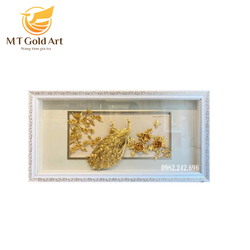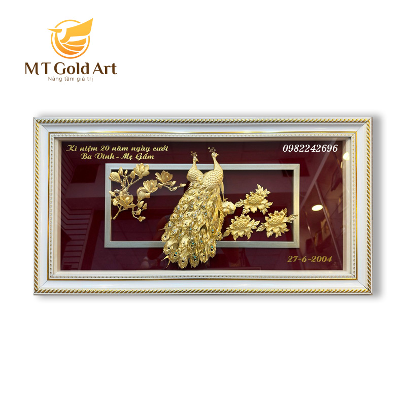 Tranh đôi chim công dát vàng làm quà tặng kỷ niệm 10 năm ngày cưới ca ngợi vợ/ chồng với những đức tính hiền lành, chung thủy.