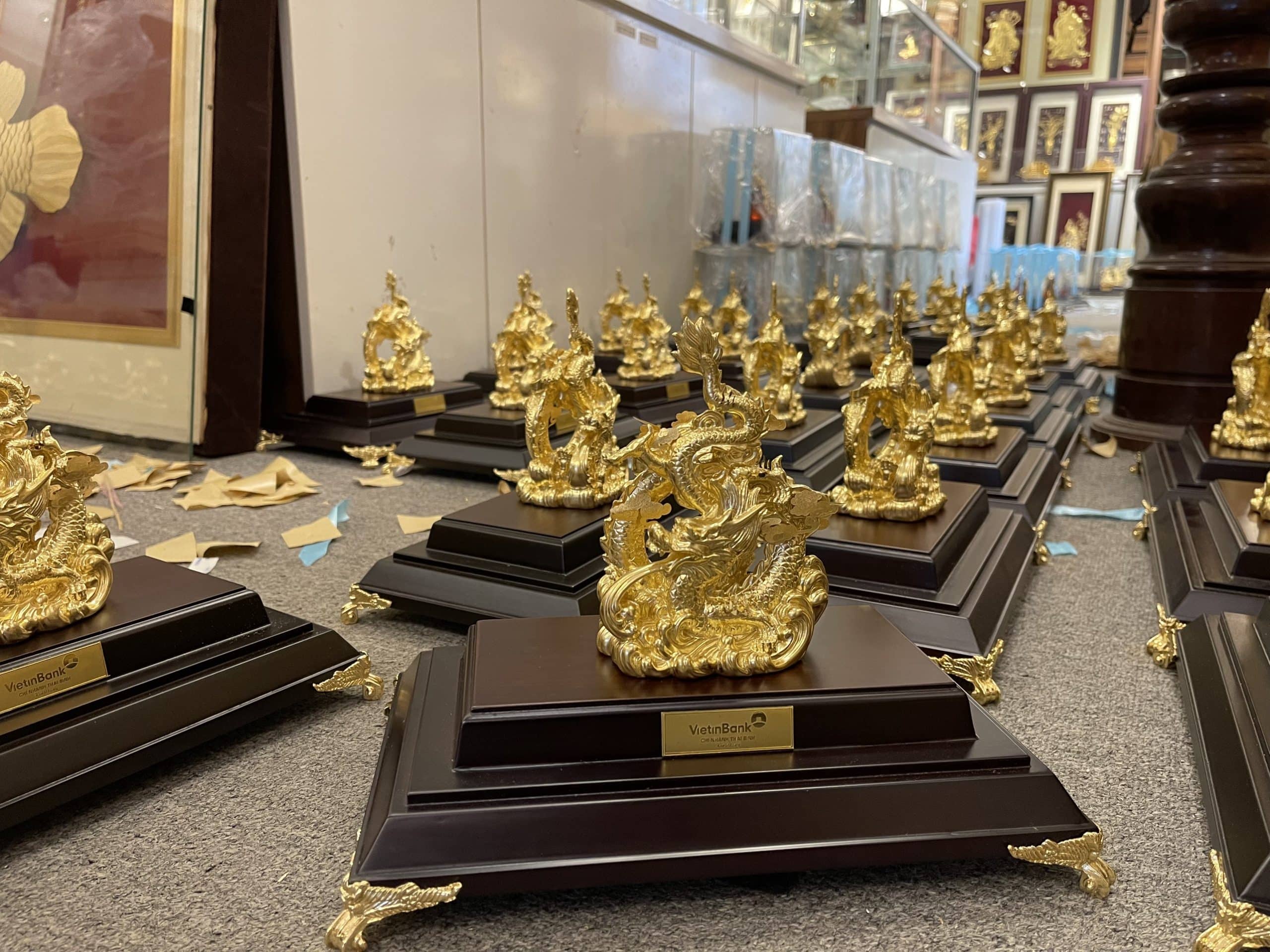 Tượng rồng dát vàng là món quà tặng sếp hoàn hảo. Sếp của bạn có thể đặt món quà này trong phòng làm việc của mình. Căn phòng sẽ tăng thêm phần sang trọng, hiện đại. Quan trọng hơn cả, sản phẩm này còn mang đến may mắn, tài lộc cho chủ nhân của nó.Hình tượng con rồng là loài vật rất linh thiêng trong quan niệm phong thủy của người Việt Nam. Rồng khi được các nghệ nhân dát lên một lớp vàng lá 24k đã tạo ra một diện mạo mới.
