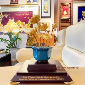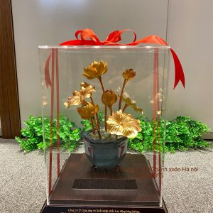 Chậu hoa sen được chế tác hoàn toàn bằng phương pháp thủ công, sử dụng chất liệu vàng lá cao cấp 24k. Hình ảnh những bông hoa sen vươn mình bông nở, bông nụ đan xen cùng lá, tạo lên tổng thể hài hòa và sinh động. Chậu hoa sen mô phỏng hình ảnh đóa sen vô cùng sắc nét, tỉ mỉ đến từng nhụy hoa, cánh hoa. Tổng thể tạo nên một tác phẩm nghệ thuật độc đáo dùng để trang trí cho những không gian sang trọng.