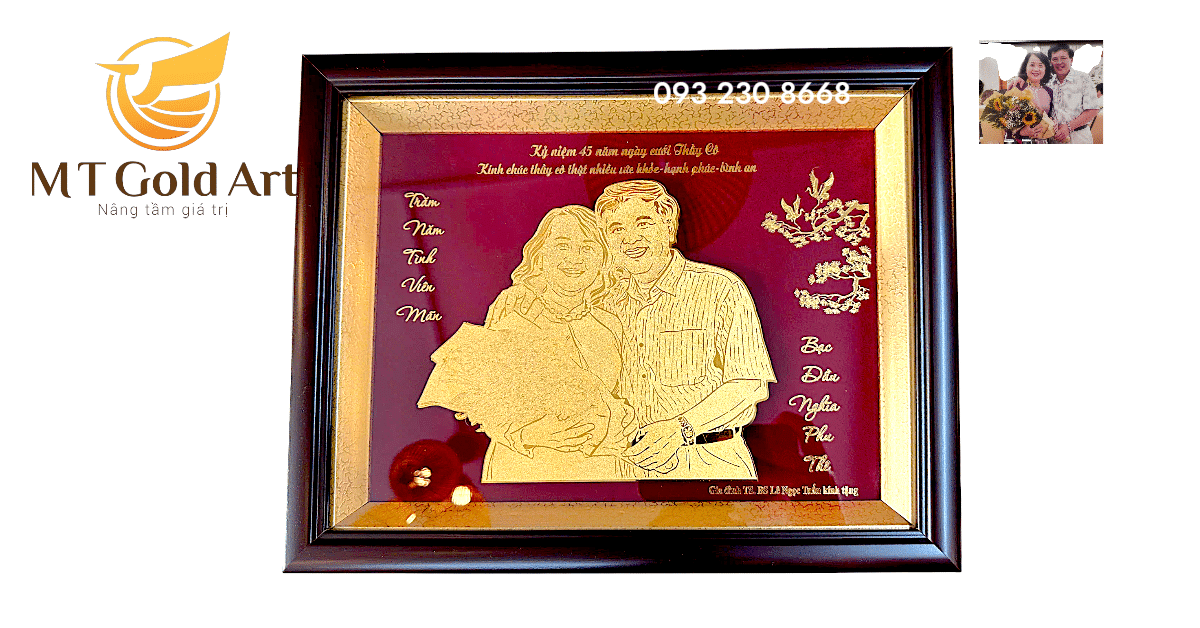 -Tranh chân dung dát vàng theo yêu cầu là món quà ý nghĩa và vô cùng độc đáo. Tranh chân dung là một cách để lưu giữ những hình ảnh kỉ niệm đáng nhớ. Đó có thể là một bức chân dung của bạn ở một độ tuổi hay ở một cột mốc đặc biệt của cuộc đời. Bạn có thể lưu giữ những khoảnh khắc đó qua những bức ảnh hay thước phim. Tuy nhiên, theo thời gian, bức ảnh có thể phai màu và thước phim có thể phai mờ. Còn với tranh dát vàng chế tác từ vàng 24K cao cấp. Đảm bảo bền bỉ và không bị tác động của thời gian tàn phá. Hình ảnh và khoảnh khắc đáng nhớ của bạn sẽ được lưu giữ mãi mãi. Bức tranh được các nghệ nhân MT Gold Art thiết kế tinh tế, tỉ mỉ từ những chi tiết nhỏ nhất giúp bức tranh trở nên sinh động như thật.